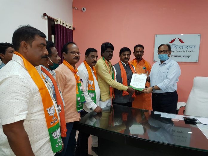 महावितरणाने ७५ लाख वीज ग्राहकांना कनेक्शन तोडण्याची नोटीस पाठवून महाराष्ट्रातील ४ कोटी जनतेला अंधारात टाकण्याचे धाडस केले आहे. हा प्रकार चंद्रपुर जिल्ह्यातही होतोय. शासनाच्या इशाऱ्यावर महावितरण द्वारे निर्गमित वीज पुरवठा खंडित करण्याचा आदेश   तात्काळ मागे घेण्यात येऊन जनतेला न्याय द्यावा. अशी मागणी यावेळी भाजपाच्या वतीने डॉ गुलवाडे यांनी केली.मागण्या पूर्ण न झाल्यास आंदोलन अधिक तीव्र करण्यात येईल,व याची सर्व जवाबदारी महावितरण व्यवस्थापनाची असेल,अशी चेतावणी  त्यांनी दिली.यावेळी महामंत्री ब्रिजभूषण पाझारे यानीही समयोचित मार्गदर्शन केले.यावेळी आयोजित सभेचे संचालन करून संदीप आगलावे यांनी आभार मानले.आंदोलनात हिरामनी पाल, निशा समाजपती, मुन्नीदेवी निषाद, चंदा रविदास, चांद वर्मा महिला मोर्चाच्या चिंता केवट, ज्योती रामलवार, निर्मला उरकुडे,मीना पारपल्लीवार,सुनीता चव्हाण,निर्मला वर्मा, सुनीता पवार गणेश गेडाम यांनी सहभाग नोंदविला आंदोलनानंतर एका शिष्टमंडळाने महावितरणचे मुख्य कार्यकारी अभियंता  यांना निवेदन सादर केले.