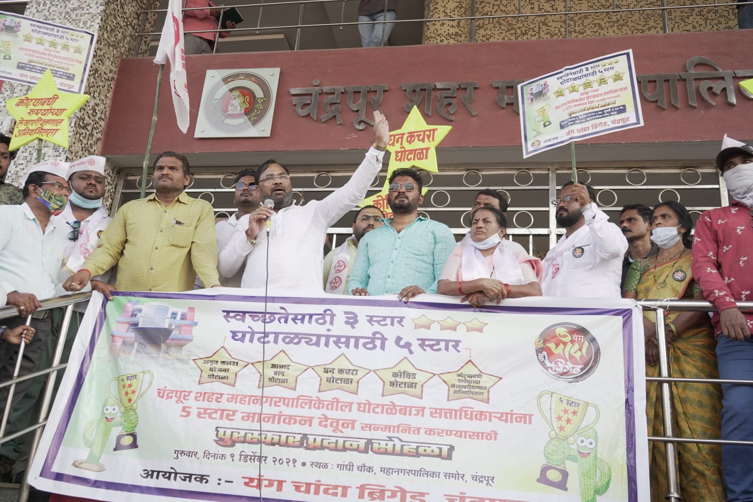 मनपातील भ्रष्टाचाऱ्यांनी मागील चार वर्षात अमृत कलश योजना घोटाळा, घनकचरा घोटाळा, कोविड घोटाळा, आझाद बाग घोटाळा, लेखापरिक्षणात कोट्यावधी रुपयांची अनियमितता यांसह अनेक घोटाळे करत राज्यातील सर्वाधिक भ्रष्ट महानगरपालिका म्हणून स्व:ताची ओळख निर्माण केली आहे. आता या भ्रष्टाचाऱ्यांना धडा शिकविण्याचा संकल्प चंद्रपूरकरांनी केला असून हे आंदोलन याची सुरवात असल्याचेही ते यावेळी म्हणाले, दुपारी 2 वाजता यंग चांदा बिग्रेडच्या कार्यालयातून या आंदोलनाला सुरुवात झाली. यावेळी मनपा विरोधात घोषणाबाजी करत आंदोलनकर्ते महानगरपालिकेवर धडकले. येथे या आंदोलनाचे रुपांतर 5 स्टार पुरस्कार वितरण सोहळ्यात झाले. यावेळी प्रतिकात्मक महापौर आणि उपमहापौर यांना 5 स्टार नामांकन देत शाल, श्रीफळ देऊन त्यांचा गौरव करण्यात आला. या आंदोलनाला यंग चांदा ब्रिगेडच्या कार्यकर्त्यांसह नागरिकांची मोठ्या संख्येने उपस्थिती होती.