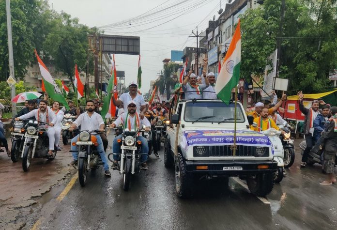 चंद्रपूर शहर जिल्हा काँग्रेस कमिटीचे अध्यक्ष रितेश (रामू) तिवारी यांच्या नेतृत्वात काढण्यात आलेल्या आझादी गौरव पदयात्रेचा रविवारी (ता. १४) समारोप झाला. यावेळी आमदार विजयभाऊ वडेट्टीवार बोलत होते. भर पावसात काढण्यात आलेल्या वाहन रॅलीत शेकडो पदाधिकारी, कार्यकर्ते मोठ्या संख्येने सहभागी झाले होते. स्वातंत्र्याच्या अमृत महोत्सवानिमित्त महाराष्ट्र प्रदेश काँग्रेस कमिटीने स्वातंत्र्याचा गौरवशाली इतिहास लोकांसमोर मांडण्यासाठी आणि स्वातंत्र्य चळवळीतील स्वातंत्र्य संग्राम सैनिकांना स्मरण करण्यासाठी आझादी गौरव पदयात्रा काढण्याची सूचना केली होती. त्यानुसार चंद्रपूर शहर जिल्हा काँग्रेस कमिटीच्या वतीने ९ ते १४ ऑगस्ट या कालावधीत शहरातील विविध प्रभागात आझादी गौरव पदयात्रा काढण्यात आली.